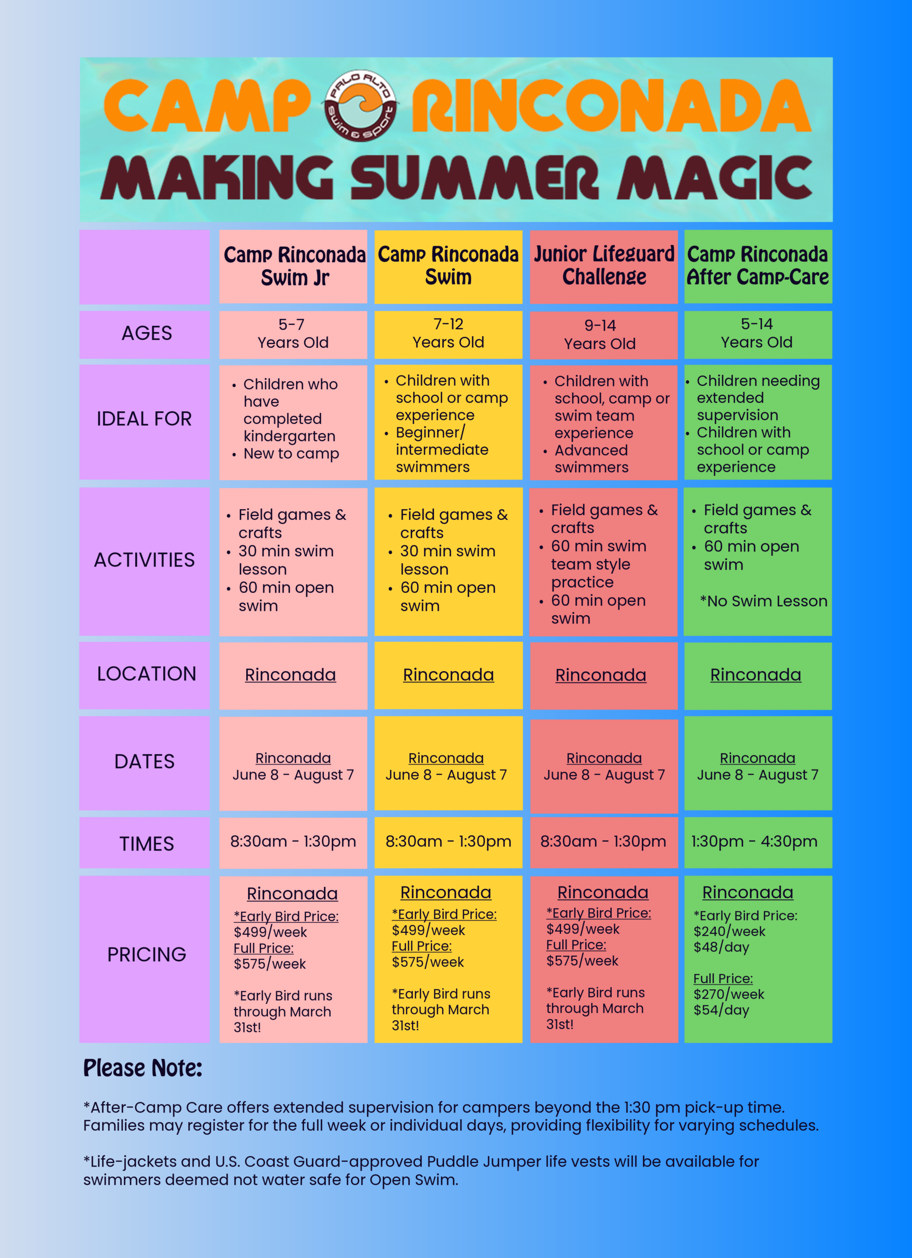 Our “Camp Welcome Letter” will be emailed the Friday before Camp starts with a breakdown of the daily schedule you can expect from us at Camp Rinconada Swim. 2025 Welcome Letter available for preview here!