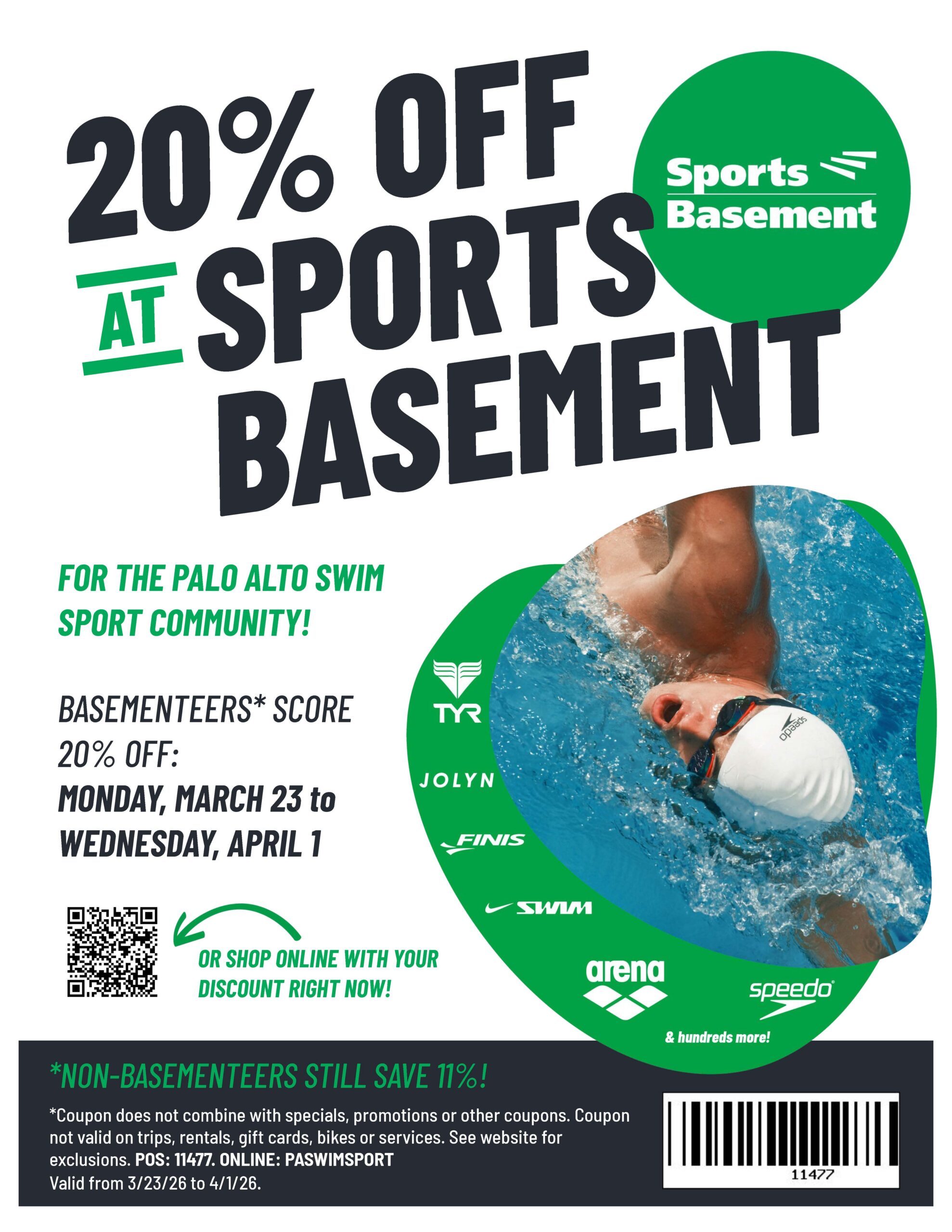 Palo Alto Swim & Sport is excited to announce a special 11% – 20% discount for our swim community at Sports Basement that runs March 23rd – April 1st.